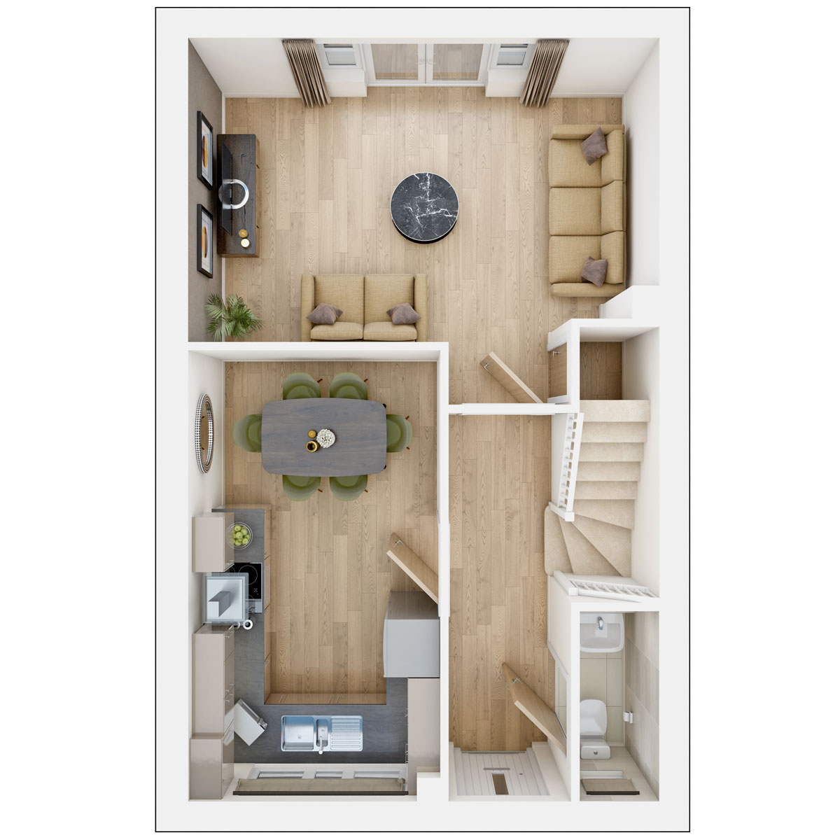 On the ground floor, you’re welcomed by an open‑plan kitchen and dining space, a cosy living room with elegant French doors leading out to the garden, plus a handy downstairs cloakroom.