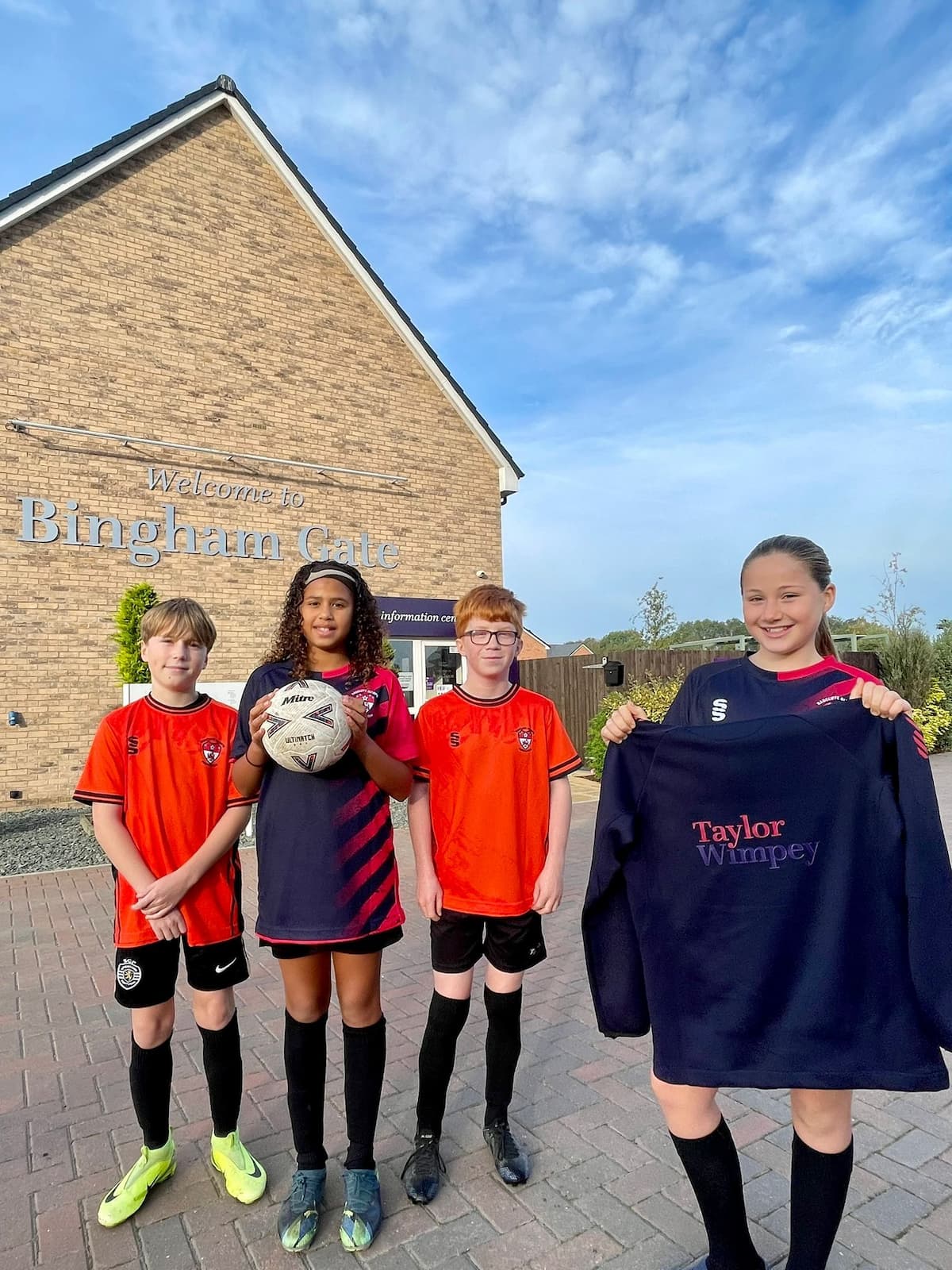 “Grassroots sport thrives on the commitment of volunteers and generous support from companies like Taylor Wimpey,” said the team’s coach Rich Brown, as the children debuted their new training tops outside the developer’s Bingham Gate development in Chapel Lane in nearby Bingham.