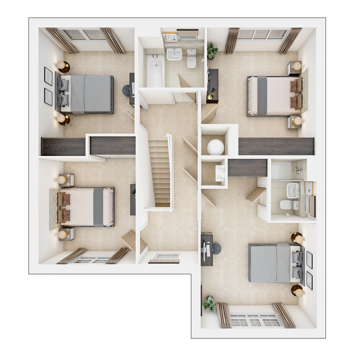 The first floor features four double bedrooms as well as a main bathroom. Bedroom 1 benefits from a convenient en-suite bathroom. Images and floorplans are used for illustrative purposes only and may not accurately reflect the final specification, layout, or appearance of the home. For the most accurate and up-to-date information, please speak to our Sales Executive.