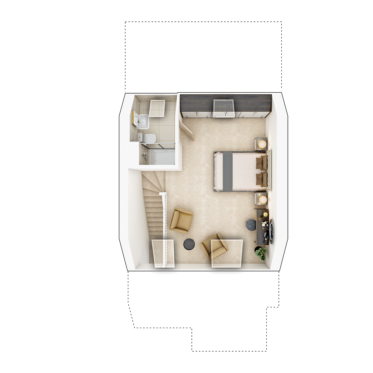 The second floor is home to the main bedroom, which spans the full width of the home. In addition, the main bedroom benefits from an en-suite shower room.